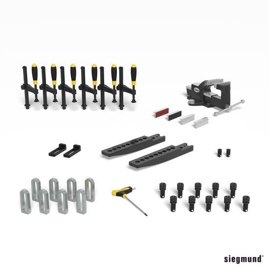 ‐ 6x 160620 Szorító, 10x 160511 Csavar, 8x 160412 Végállító, 2x 160108.N Derékszög, 2x 164050 Bővítés perforált lemezekhez, 2x 160528 Süllyesztettfejű csavar, 1x 160852 Hatszögkulcs, 1x 164310 Asztali satu tartalmazza Satu szorítópofa készlet